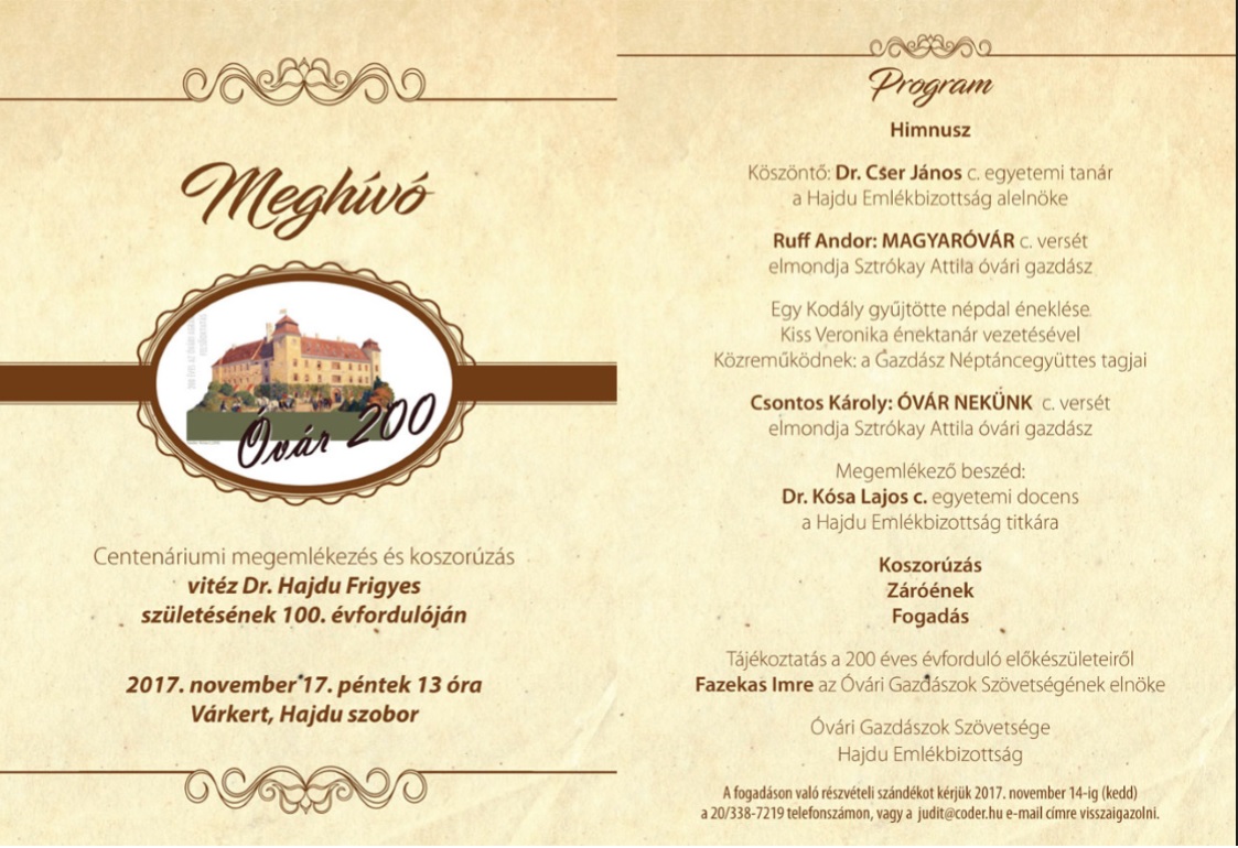 2017. november 17-én Vitéz Dr. Hajdu Frigyes születésének 100. évfordulóján az Óvári Gazdászok Szövetsége és a Hajdu Emlékbizottság megemlékezést tartottak a Hajdu szobornál.