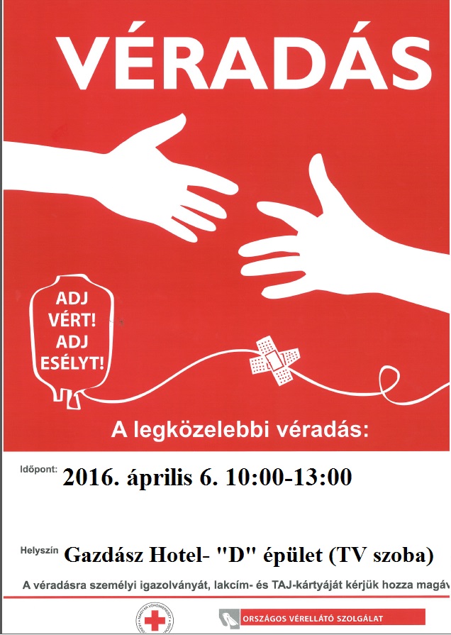 Idén áprilisban, az elmúlt évek gyakorlatához hasonlóan ismételten megrendezésre kerül- a Vörös Kereszt Területi Képviselete, a Széchenyi István Egyetem, Mezőgazdaság- és Élelmiszertudományi Kaa, valamint a helyi Rotaract közös szervezésében- a tavaszi véradás, melynek helyszíne a már jól bevált módon: (Cserháti Sándor Kollégium) Gazdász Hotel- D épületi TV szoba.